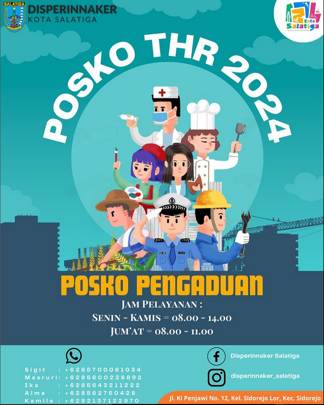 Warga Salatiga, berikut kami sampaikan Posko Pengaduan Tunjangan Hari Raya (THR) Keagamaan di Tahun 2024. Bila dulur ingin mencari informasi dan menyampaikan aduan seputar THR, dipersilahkan untuk menghubungi nomor berikut pada jam pelayanan yang tertera ya. Atau bisa datang langsung ke Kantor Disperinnaker Kota Salatiga di Jl. Ki Penjawi No.12a, Sidorejo Lor, Sidorejo, Salatiga.